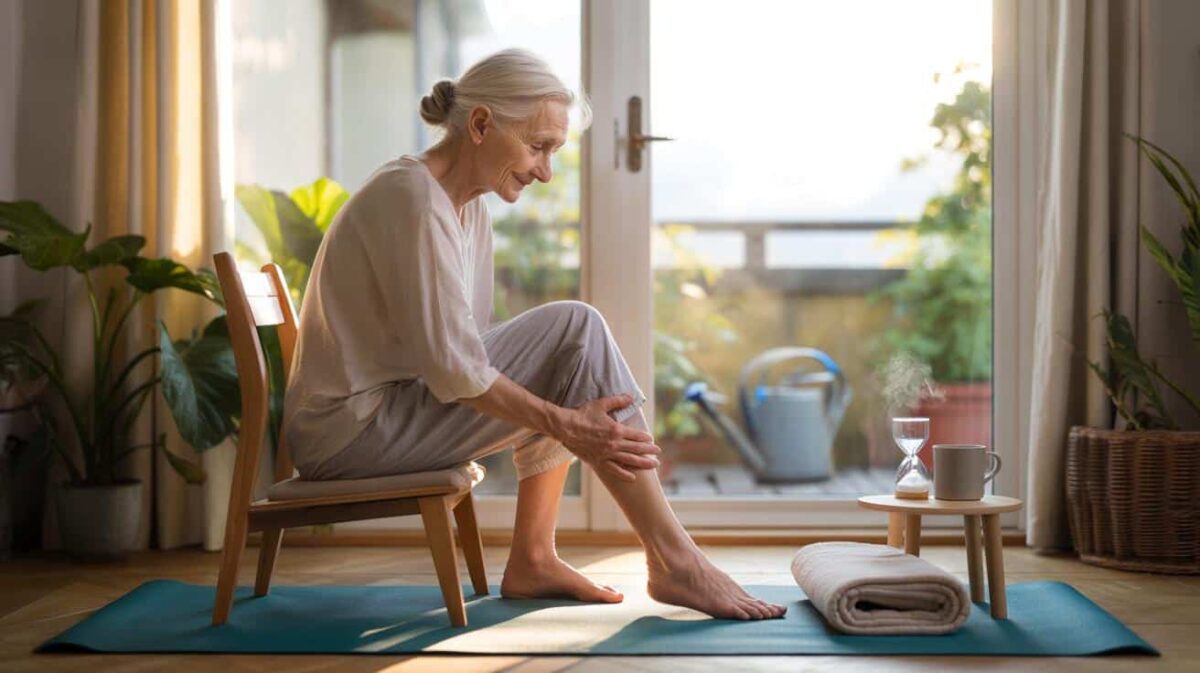 Eine 72-Jährige sitzt auf der Bettkante und massiert ihre Knie. Der Bus fährt ohne sie, die Treppe wirkt plötzlich wie
